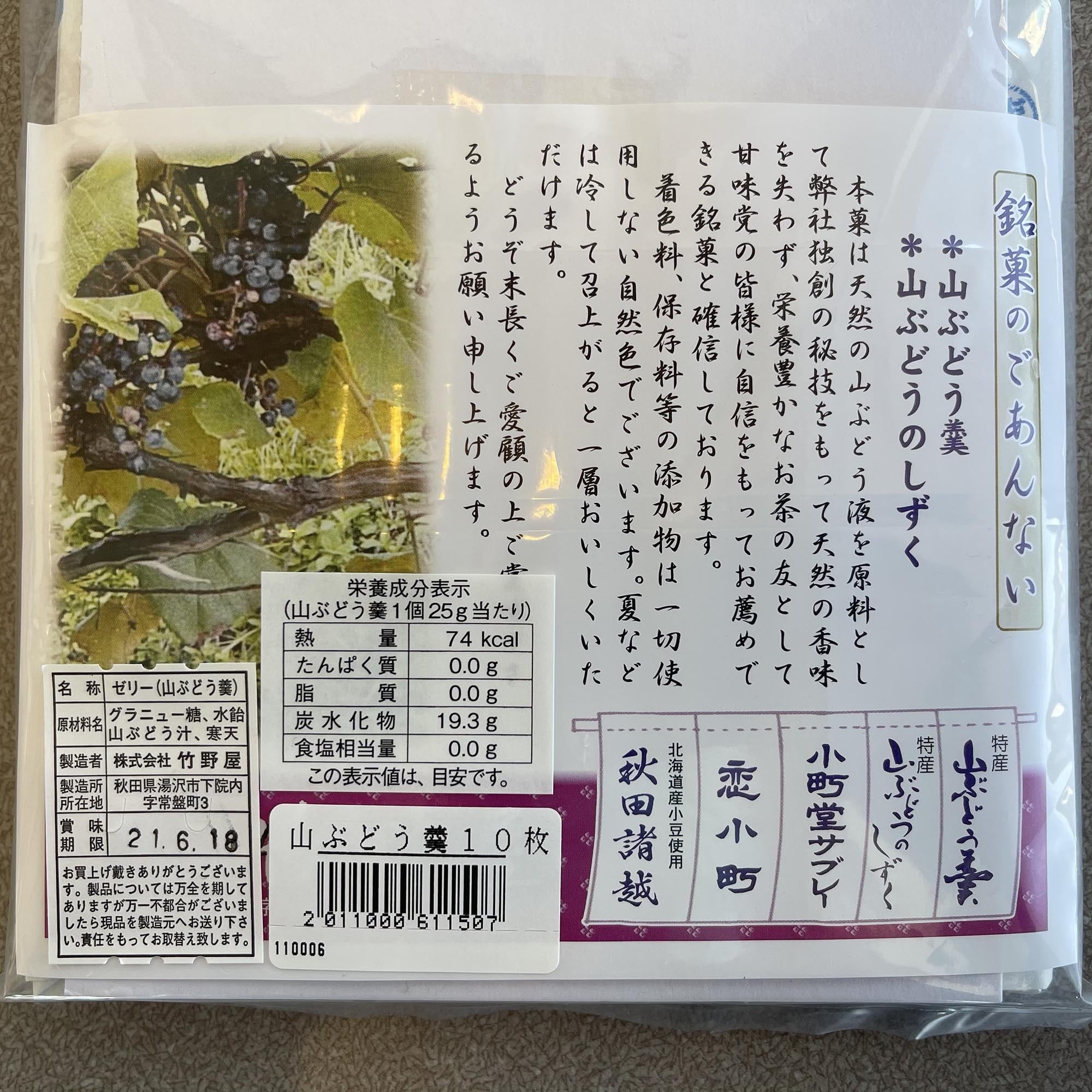 天然の山ぶどう液を原料とした、山ぶどうの風味をそのままに再現したゼリー状の和菓子です。
