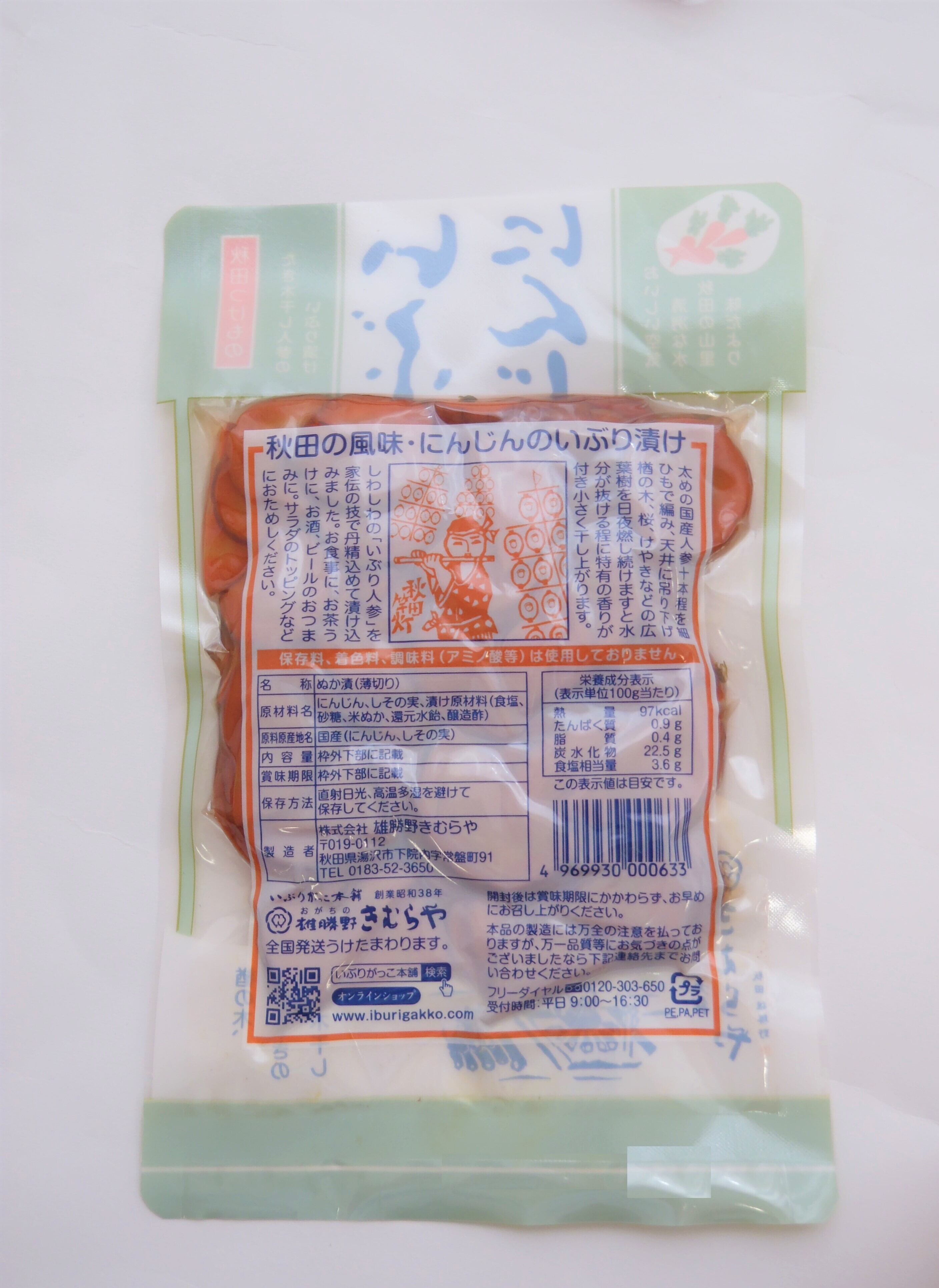 燻製文化が根付く秋田県の誇るお漬物いぶりがっこ、大根のイメージが強いですが、ご存知でしょうか?人参もいぶりがっこにします。人参の風味が引き立ち甘味が出て、美味しいです。オススメの逸品。日本酒なんか合わせてもいいですねぇ!